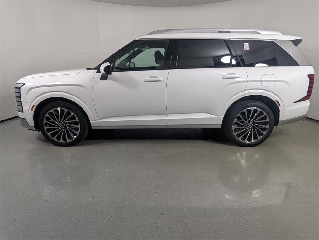 Features: Option Group 01, Palisade Calligraphy, 4D Sport Utility, V6, 8-Speed Automatic, AWD, Creamy White Pearl, Black Leather, 14 Speakers, 3rd row seats: split-bench, 4-Wheel Disc Brakes, ABS brakes, Air Conditioning, Alloy wheels, AM/FM radio: SiriusXM, Apple CarPlay & Android Auto, Audio memory, Auto High-beam Headlights, Auto-dimming door mirrors, Auto-dimming Rear-View mirror, Auto-leveling suspension, Automatic temperature control, Brake assist, Bumpers: body-color, Cargo Cover, Cargo Net, Cargo Tray, Carpeted Floor Mats, Compass, Delay-off headlights, Driver door bin, Driver vanity mirror, Dual front impact airbags, Dual front side impact airbags, Electronic Stability Control, Emergency communication system: Bluelink+, Exterior Parking Camera Rear, First Aid Kit, Four wheel independent suspension, Front anti-roll bar, Front Bucket Seats, Front Center Armrest, Front dual zone A/C, Front reading lights, Fully automatic headlights, Garage door transmitter: HomeLink, Genuine wood console insert, Genuine wood dashboard insert, Heads-Up Display, Heated & Ventilated Front Bucket Seats, Heated door mirrors, Heated front seats, Heated rear seats, Heated steering wheel, HVAC memory, Illuminated entry, Knee airbag, Leather steering wheel, Low tire pressure warning, Memory seat, Navigation System, Occupant sensing airbag, Outside temperature display, Overhead airbag, Overhead console, Panic alarm, Passenger door bin, Passenger vanity mirror, Power door mirrors, Power driver seat, Power Liftgate, Power moonroof, Power passenger seat, Power steering, Power windows, Premium Nappa Leather Seat Trim, Radio data system, Radio: Infotainment Navigation System, Rain sensing wipers, Rear air conditioning, Rear anti-roll bar, Rear audio controls, Rear reading lights, Rear side impact airbag, Rear window defroster, Rear window wiper, Reclining 3rd row seat, Remote keyless entry, Security system, Speed control, Split folding rear seat, Spoiler, Steering wheel mounted audio controls, Tachometer, Telescoping steering wheel, Tilt steering wheel, Traction control, Trip computer, Turn signal indicator mirrors, Variably intermittent wipers, Ventilated front seats, Ventilated rear seats, and Wheels: 21" x 8.5J Alloy.