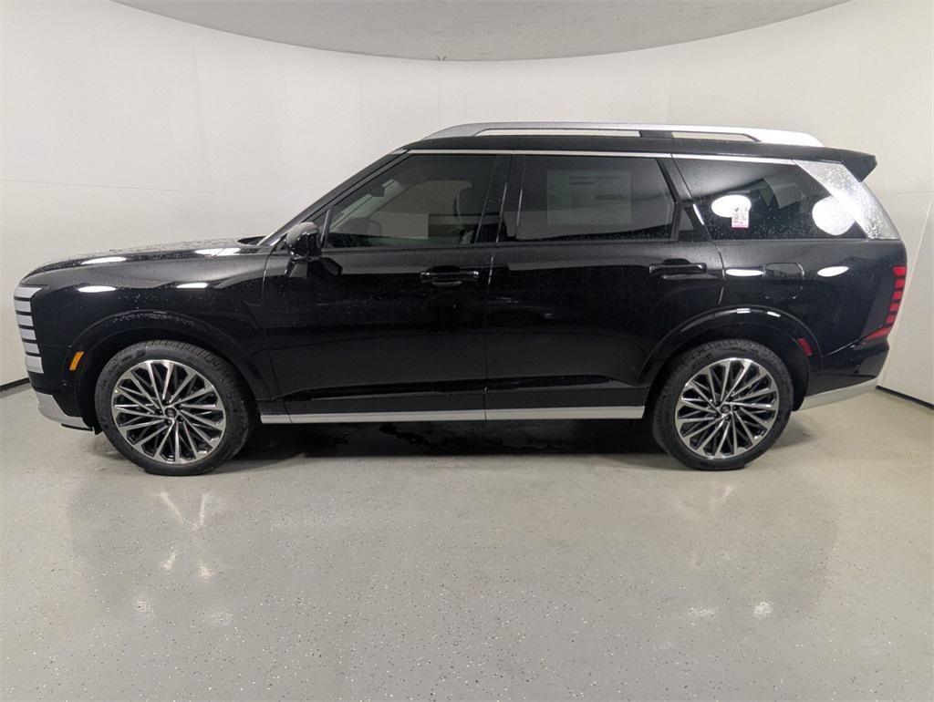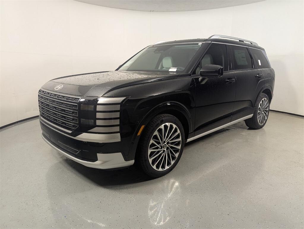 Features: Option Group 01, Palisade Calligraphy, 4D Sport Utility, V6, 8-Speed Automatic, FWD, Abyss Black Pearl, Gray/Navy Leather, 14 Speakers, 3rd row seats: split-bench, 4-Wheel Disc Brakes, ABS brakes, Air Conditioning, Alloy wheels, AM/FM radio: SiriusXM, Apple CarPlay & Android Auto, Audio memory, Auto High-beam Headlights, Auto-dimming door mirrors, Auto-dimming Rear-View mirror, Auto-leveling suspension, Automatic temperature control, Brake assist, Bumpers: body-color, Cargo Net, Cargo Tray, Carpeted Floor Mats, Compass, Delay-off headlights, Driver door bin, Driver vanity mirror, Dual front impact airbags, Dual front side impact airbags, Electronic Stability Control, Emergency communication system: Bluelink+, Exterior Parking Camera Rear, First Aid Kit, Four wheel independent suspension, Front anti-roll bar, Front Bucket Seats, Front Center Armrest, Front dual zone A/C, Front reading lights, Fully automatic headlights, Garage door transmitter: HomeLink, Genuine wood console insert, Genuine wood dashboard insert, Heads-Up Display, Heated & Ventilated Front Bucket Seats, Heated door mirrors, Heated front seats, Heated rear seats, Heated steering wheel, HVAC memory, Illuminated entry, Knee airbag, Leather steering wheel, Low tire pressure warning, Memory seat, Navigation System, Occupant sensing airbag, Outside temperature display, Overhead airbag, Overhead console, Panic alarm, Passenger door bin, Passenger vanity mirror, Power door mirrors, Power driver seat, Power Liftgate, Power moonroof, Power passenger seat, Power steering, Power windows, Premium Nappa Leather Seat Trim, Radio data system, Radio: Infotainment Navigation System, Rain sensing wipers, Rear air conditioning, Rear anti-roll bar, Rear audio controls, Rear reading lights, Rear side impact airbag, Rear window defroster, Rear window wiper, Reclining 3rd row seat, Remote keyless entry, Roadside Assistance Kit, Security system, Speed control, Split folding rear seat, Spoiler, Steering wheel mounted audio controls, Tachometer, Telescoping steering wheel, Tilt steering wheel, Traction control, Trip computer, Turn signal indicator mirrors, Variably intermittent wipers, Ventilated front seats, Ventilated rear seats, and Wheels: 21" x 8.5J Alloy.