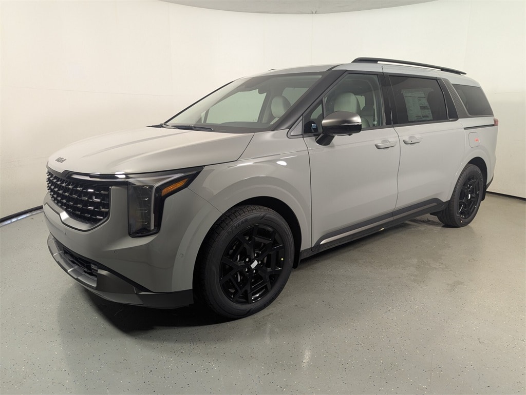 2026 Kia Ceramic Silver Carnival Hybrid 1.6L I4 DGI Hybrid Turbocharged DOHC 16V LEV3-SULEV30 SX Prestige 34/31 City/Highway MPG 1.6L I4 DGI Hybrid Turbocharged DOHC 16V LEV3-SULEV30, 12 Speakers, 3rd row seats: split-bench, 4-Wheel Disc Brakes, ABS brakes, Air Conditioning, Alloy wheels, AM/FM radio: SiriusXM, Apple CarPlay & Android Auto, Auto High-beam Headlights, Auto-dimming Rear-View mirror, Automatic temperature control, Brake assist, Bumpers: body-color, Cargo Mat, Cargo Net, Carpeted Floor Mats (8-Passenger), Compass, Cross Bars, Delay-off headlights, Driver door bin, Driver vanity mirror, Dual front impact airbags, Dual front side impact airbags, Electronic Stability Control, Emergency communication system, Exterior Parking Camera Rear, Four wheel independent suspension, Front anti-roll bar, Front Bucket Seats, Front Center Armrest, Front dual zone A/C, Front fog lights, Front reading lights, Fully automatic headlights, Garage door transmitter: HomeLink, Heads-Up Display, Heated & Ventilated Front Bucket Seats, Heated door mirrors, Heated front seats, Heated steering wheel, Illuminated entry, Knee airbag, Leather Seat Trim, Leather Shift Knob, Leather steering wheel, Low tire pressure warning, Memory seat, Mud Guards, Navigation System, Occupant sensing airbag, Outside temperature display, Overhead airbag, Overhead console, Panic alarm, Passenger door bin, Passenger vanity mirror, Power 2nd-Row Moonroof, Power door mirrors, Power driver seat, Power Liftgate, Power moonroof, Power passenger seat, Power steering, Power windows, Radio: Navigation System w/SiriusXM, Rain sensing wipers, Rear air conditioning, Rear anti-roll bar, Rear reading lights, Rear window defroster, Rear window wiper, Reclining 3rd row seat, Remote keyless entry, Security system, Speed control, Speed-sensing steering, Split folding rear seat, Spoiler, Steering wheel mounted audio controls, Tachometer, Telescoping steering wheel, Tilt steering wheel, Traction control, Trip computer, Turn signal indicator mirrors, Variably intermittent wipers, Ventilated front seats, Wheel Locks, Wheels: 19" Black D-Cut Customizing, 1.6L I4 DGI Hybrid Turbocharged DOHC 16V LEV3-SULEV30. 34/31 City/Highway MPG