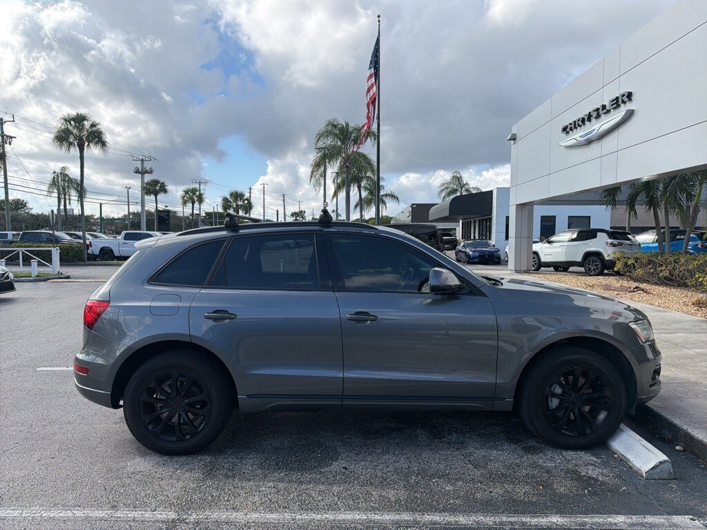 This Q5 is well equipped with Black Leather, 10 Speakers, 2.84 Axle Ratio, 4-Wheel Disc Brakes, ABS brakes, Air Conditioning, Alloy wheels, AM/FM radio, Automatic temperature control, Brake assist, Bumpers: body-color, CD player, Delay-off headlights, Driver door bin, Driver vanity mirror, Dual front impact airbags, Dual front side impact airbags, Electronic Stability Control, Four wheel independent suspension, Front anti-roll bar, Front Bucket Seats, Front Center Armrest, Front dual zone A/C, Front fog lights, Front reading lights, Garage door transmitter: HomeLink, Genuine wood console insert, Genuine wood dashboard insert, Genuine wood door panel insert, Heated door mirrors, High intensity discharge headlights: Xenon plus, Illuminated entry, Leather Seating Surfaces, Leather Shift Knob, Leather steering wheel, Low tire pressure warning, Occupant sensing airbag, Outside temperature display, Overhead airbag, Overhead console, Panic alarm, Passenger door bin, Passenger vanity mirror, Power door mirrors, Power driver seat, Power Front Bucket Seats, Power Liftgate, Power passenger seat, Power steering, Power windows, Radio data system, Radio: Audi MMI Plus System w/6.5" Color Screen, Rain sensing wipers, Rear air conditioning, Rear anti-roll bar, Rear fog lights, Rear reading lights, Rear seat center armrest, Rear window defroster, Rear window wiper, Remote keyless entry, Roof rack, Security system, Speed control, Speed-sensing steering, Speed-Sensitive Wipers, Split folding rear seat, Spoiler, Steering wheel mounted audio controls, Tachometer, Telescoping steering wheel, Tilt steering wheel, Traction control, Trip computer, Turn signal indicator mirrors, Variably intermittent wipers, and Wheels: 8.0J x 18" 5-V-Spoke-Design.