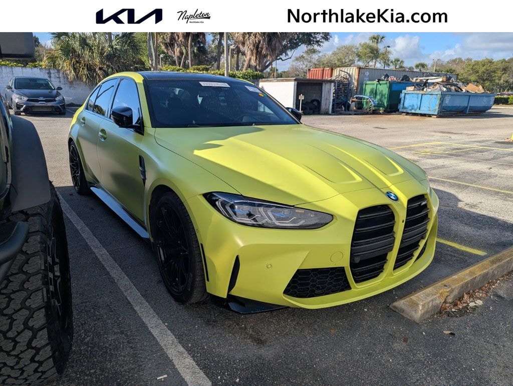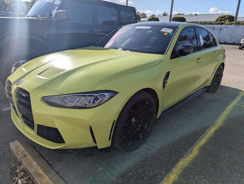 2021 BMW M3 Base Beautifully finished in Yellow with Black Leather interior. 3.0L I6 Turbocharged DOHC 24V LEV3-ULEV70 473hp 4D Sedan RWD 6-Speed Manual 16 Speakers, 4-Wheel Disc Brakes, ABS brakes, Adaptive suspension, Air Conditioning, Alloy wheels, AM/FM radio: SiriusXM with 360L, Apple CarPlay & Android Auto Compatibility, Auto High-beam Headlights, Auto-dimming door mirrors, Auto-dimming Rear-View mirror, Automatic temperature control, BMW Assist eCall, BMW TeleServices, Brake assist, Bumpers: body-color, Carbon Fiber Trim, Compass, ConnectedDrive Services, Delay-off headlights, Drive Recorder, Driver door bin, Driver vanity mirror, Dual front impact airbags, Dual front side impact airbags, Electronic Stability Control, Emergency communication system: BMW Assist eCall, Extended Merino Leather Seat Upholstery, Extended Shadowline Trim, Exterior Parking Camera Rear, Four wheel independent suspension, Front anti-roll bar, Front Bucket Seats, Front Center Armrest, Front dual zone A/C, Front reading lights, Fully automatic headlights, Garage door transmitter, Gesture Control, harman/kardon Surround Sound System, harman/kardon® Speakers, Head-Up Display, Heated door mirrors, Heated Front Seats, Heated front seats, Heated Steering Wheel, Icon Adaptive LED Headlights w/Laserlight, Illuminated entry, Knee airbag, Leather Shift Knob, Live Cockpit Pro w/Navigation, Low tire pressure warning, Lumbar Support, M Sport Seats, Memory seat, Navigation System, Occupant sensing airbag, Outside temperature display, Overhead airbag, Panic alarm, Parking Assistant Plus, Passenger door bin, Passenger vanity mirror, Power door mirrors, Power driver seat, Power Front Seats, Power passenger seat, Power steering, Power Tailgate, Power windows, Radio data system, Radio: AM/FM Audio System, Rain sensing wipers, Rear air conditioning, Rear anti-roll bar, Rear reading lights, Rear window defroster, Remote keyless entry, Security system, SiriusXM w/360L, Speed control, Speed-sensing steering, Speed-Sensitive Wipers, Split folding rear seat, Spoiler, Sport steering wheel, Steering wheel mounted audio controls, Tachometer, Telescoping steering wheel, Tilt steering wheel, Traction control, Trip computer, Turn signal indicator mirrors, Variably intermittent wipers, Wheels: 18"x9.5" Fr. & 19"x10.5"Rr. M Orbit Grey, Wheels: 19"x9.5" Fr. & 20"x10.5" Rr M Black, WiFi Hotspot, Wireless Charging. Clean CARFAX. Priced below KBB Fair Purchase Price!