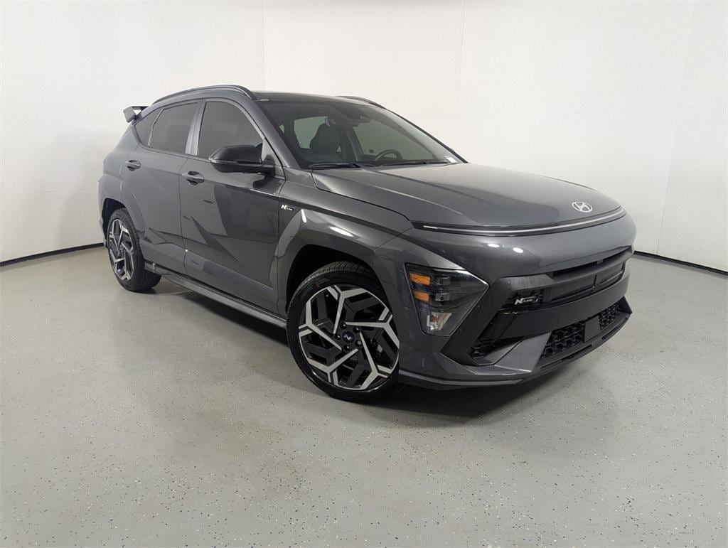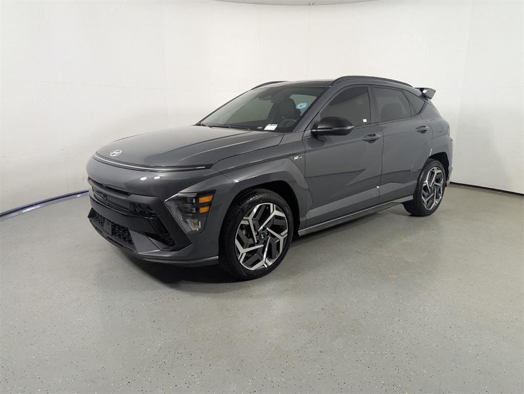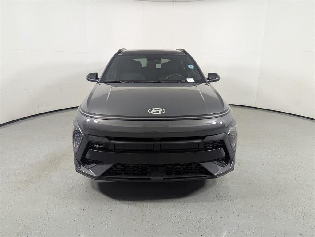 Features: Option Group 01, Kona N Line, 4D Sport Utility, I4, 8-Speed Automatic, FWD, Ecotronic Gray Pearl, Black Artificial Leather, 3.510 Axle Ratio, 4-Wheel Disc Brakes, 8 Speakers, ABS brakes, Air Conditioning, Alloy wheels, AM/FM radio: SiriusXM, Apple CarPlay & Android Auto, Auto High-beam Headlights, Auto-dimming Rear-View mirror, Automatic temperature control, Brake assist, Bumpers: body-color, Cargo Tray, Carpeted Floor Mats, Column-Mounted Shift-By-Wire, Delay-off headlights, Driver door bin, Driver vanity mirror, Dual front impact airbags, Dual front side impact airbags, Electronic Stability Control, Emergency communication system: Bluelink+, Exterior Parking Camera Rear, First Aid Kit, Front anti-roll bar, Front Bucket Seats, Front Center Armrest, Front dual zone A/C, Front reading lights, Front wheel independent suspension, Fully automatic headlights, Heated door mirrors, Heated front seats, Heated Front Sport Bucket Seats, Illuminated entry, Leather Shift Knob, Leather steering wheel, Low tire pressure warning, N-Line Alcantara Sport Combination Seat Trim, Navigation System, Occupant sensing airbag, Outside temperature display, Overhead airbag, Panic alarm, Passenger door bin, Passenger vanity mirror, Power door mirrors, Power driver seat, Power moonroof, Power steering, Power windows, Radio: AM/FM/HD Radio/SiriusXM Audio System, Rear Bumper Applique, Rear seat center armrest, Rear window defroster, Rear window wiper, Remote keyless entry, Security system, Speed control, Speed-sensing steering, Split folding rear seat, Spoiler, Steering wheel mounted audio controls, Tachometer, Telescoping steering wheel, Tilt steering wheel, Traction control, Trip computer, Turn signal indicator mirrors, Variably intermittent wipers, Wheel Locks, and Wheels: 19" x 7.5J Metallic Alloy.