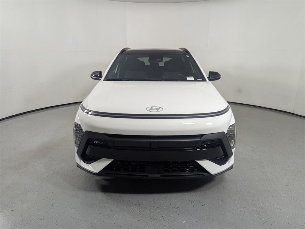 Features: Option Group 01, Kona N Line, 4D Sport Utility, I4, 8-Speed Automatic, FWD, Atlas White, Black Artificial Leather, 3.510 Axle Ratio, 4-Wheel Disc Brakes, 8 Speakers, ABS brakes, Air Conditioning, Alloy wheels, AM/FM radio: SiriusXM, Apple CarPlay & Android Auto, Auto High-beam Headlights, Auto-dimming Rear-View mirror, Automatic temperature control, Brake assist, Bumpers: body-color, Cargo Net, Cargo Tray, Carpeted Floor Mats, Column-Mounted Shift-By-Wire, Delay-off headlights, Driver door bin, Driver vanity mirror, Dual front impact airbags, Dual front side impact airbags, Electronic Stability Control, Emergency communication system: Bluelink+, Exterior Parking Camera Rear, First Aid Kit, Front anti-roll bar, Front Bucket Seats, Front Center Armrest, Front dual zone A/C, Front reading lights, Front wheel independent suspension, Fully automatic headlights, Heated door mirrors, Heated front seats, Heated Front Sport Bucket Seats, Illuminated entry, Leather Shift Knob, Leather steering wheel, Low tire pressure warning, Mud Guards, N-Line Alcantara Sport Combination Seat Trim, Navigation System, Occupant sensing airbag, Outside temperature display, Overhead airbag, Panic alarm, Passenger door bin, Passenger vanity mirror, Power door mirrors, Power driver seat, Power moonroof, Power steering, Power windows, Radio: AM/FM/HD Radio/SiriusXM Audio System, Rear seat center armrest, Rear window defroster, Rear window wiper, Remote keyless entry, Security system, Speed control, Speed-sensing steering, Split folding rear seat, Spoiler, Steering wheel mounted audio controls, Tachometer, Telescoping steering wheel, Tilt steering wheel, Traction control, Trip computer, Turn signal indicator mirrors, Variably intermittent wipers, and Wheels: 19" x 7.5J Metallic Alloy.