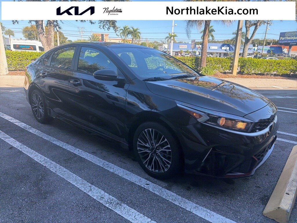2023 Kia Forte GT-Line Beautifully finished in Aurora Black Pearl with Black interior. 2.0L I4 MPI 4D Sedan FWD CVT 17" x 7.0J Alloy Wheels, 4-Wheel Disc Brakes, 6 Speakers, ABS brakes, Air Conditioning, Alloy wheels, AM/FM radio: SiriusXM, Apple CarPlay & Android Auto, Auto High-beam Headlights, Automatic temperature control, Brake assist, Bumpers: body-color, Cargo Hook, Carpet Floor Mats, Cloth & SynTex Seat Trim, Delay-off headlights, Driver door bin, Driver vanity mirror, Dual front impact airbags, Dual front side impact airbags, Electronic Parking Brake (EPB), Electronic Stability Control, Emergency communication system, Exterior Parking Camera Rear, Forward Collision Avoidance-Assist - Cyclist, Front anti-roll bar, Front Bucket Seats, Front Center Armrest, Front dual zone A/C, Front fog lights, Front reading lights, Front wheel independent suspension, Fully automatic headlights, GT-Line Technology Package, Heated door mirrors, Illuminated entry, Leather Shift Knob, Leather steering wheel, Low tire pressure warning, Navigation System, Navigation-Based Smart Cruise Control (NSCC), Occupant sensing airbag, Outside temperature display, Overhead airbag, Overhead console, Panic alarm, Passenger door bin, Passenger vanity mirror, Power door mirrors, Power steering, Power windows, Radio data system, Radio: 10.25" Display Audio, Rear Bumper Applique, Rear seat center armrest, Rear window defroster, Remote keyless entry, Security system, Smart Cruise Control w/Stop & Go, Speed control, Split folding rear seat, Spoiler, Sport steering wheel, Steering wheel mounted audio controls, Tachometer, Telescoping steering wheel, Tilt steering wheel, Traction control, Trip computer, Turn signal indicator mirrors, Variably intermittent wipers. CARFAX One-Owner. Clean CARFAX. 28/39 City/Highway MPG