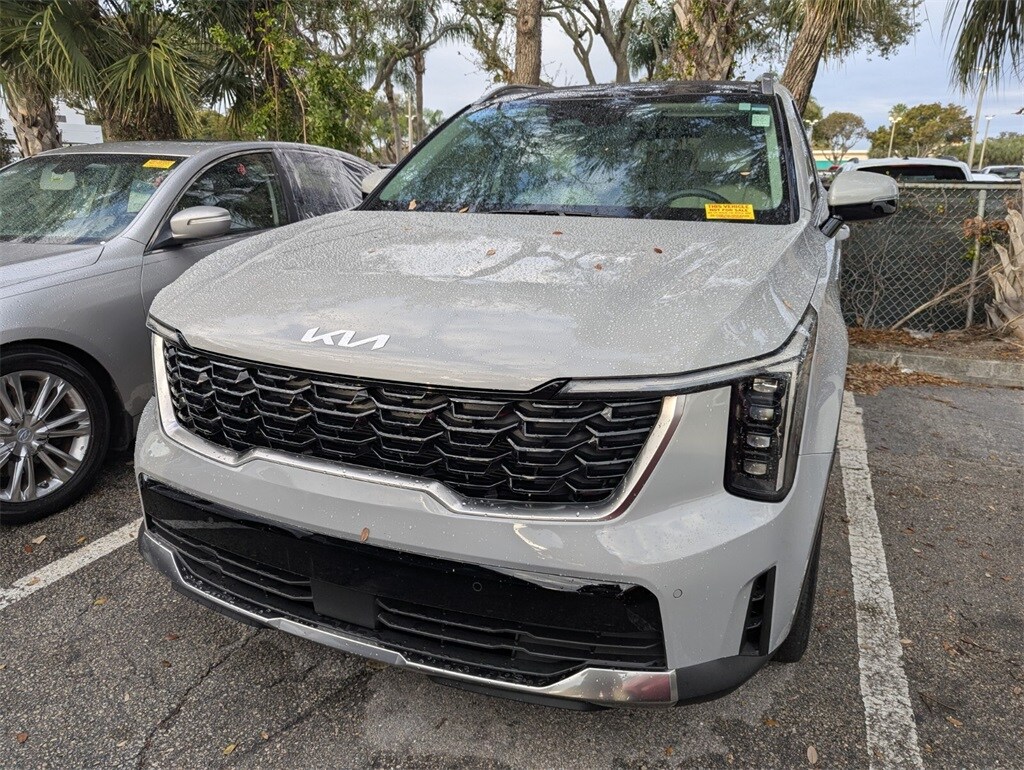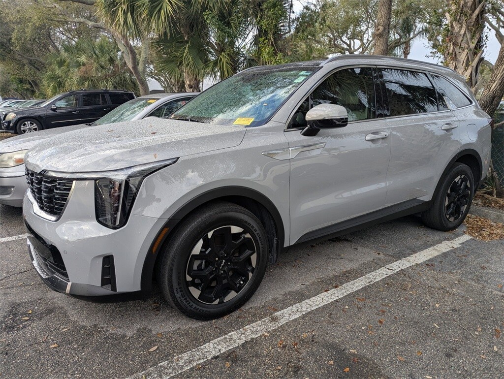 2025 Kia Sorento S Beautifully finished in Wolf Gray with Grey Artificial Leather interior. 2.5L I4 DGI DOHC 16V LEV3-SULEV30 191hp 4D Sport Utility FWD 8-Speed Automatic 3rd row seats: split-bench, 4-Wheel Disc Brakes, 6 Speakers, ABS brakes, Air Conditioning, Alloy wheels, AM/FM radio: SiriusXM, Apple CarPlay & Android Auto, Auto High-beam Headlights, Auto-Dimming Mirror w/HomeLink, Automatic temperature control, Brake assist, Bumpers: body-color, Carpeted Floor Mats, Delay-off headlights, Driver door bin, Driver vanity mirror, Dual front impact airbags, Dual front side impact airbags, Electronic Stability Control, Emergency communication system: 911 Connect, Exterior Parking Camera Rear, Four wheel independent suspension, Front anti-roll bar, Front Bucket Seats, Front Center Armrest, Front dual zone A/C, Front reading lights, Fully automatic headlights, Heated door mirrors, Heated Front Bucket Seats, Heated front seats, Illuminated entry, Knee airbag, Leather Shift Knob, Leather steering wheel, LED Interior Lighting, Low tire pressure warning, Navigation System, Occupant sensing airbag, Outside temperature display, Overhead airbag, Overhead console, Panic alarm, Panoramic Power Sunroof w/Power Sunshade, Panoramic Sunroof Package, Passenger door bin, Passenger vanity mirror, Power door mirrors, Power driver seat, Power steering, Power windows, Radio data system, Radio: AM/FM Standard Sound System, Rear anti-roll bar, Rear reading lights, Rear seat center armrest, Rear side impact airbag, Rear window defroster, Rear window wiper, Remote keyless entry, Security system, Speed control, Speed-sensing steering, Split folding rear seat, Spoiler, Steering wheel mounted audio controls, SynTex Artificial Leather Seat Trim, Tachometer, Telescoping steering wheel, Tilt steering wheel, Traction control, Trip computer, Turn signal indicator mirrors, Variably intermittent wipers, Wheels: 18" Gloss Black Alloy. Clean CARFAX. 23/31 City/Highway MPG