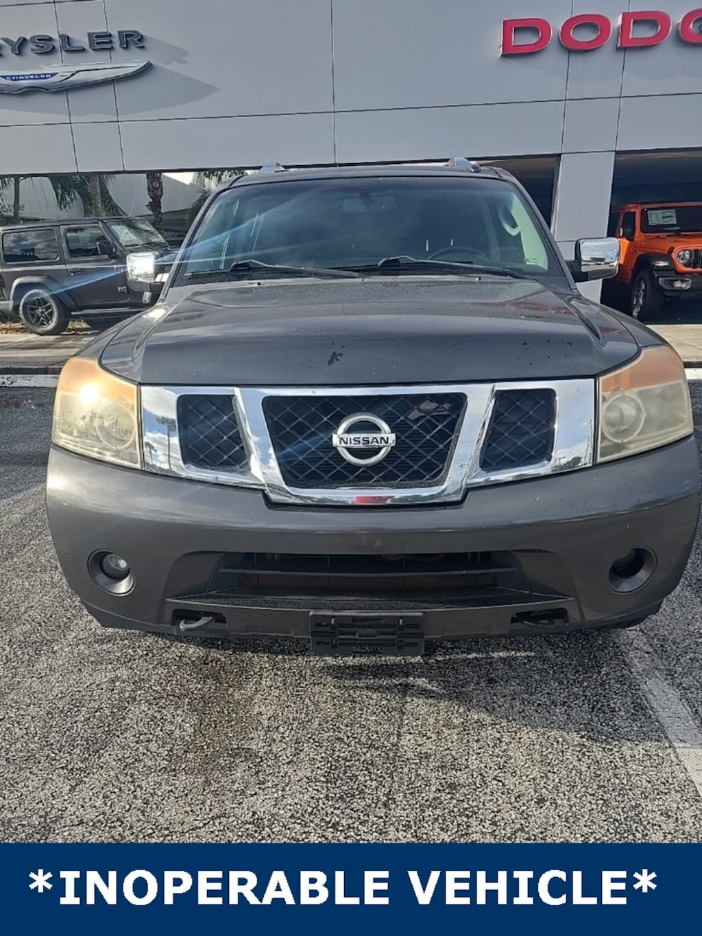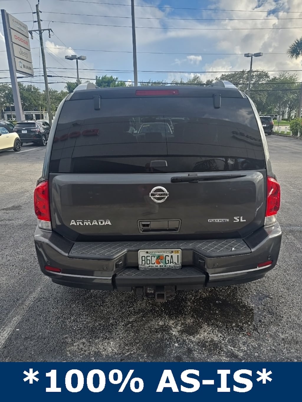 This Armada is well equipped with 4WD, 12 Speakers, 3.357 Axle Ratio, 3rd row seats: split-bench, 4-Wheel Disc Brakes, ABS brakes, Adjustable pedals, Air Conditioning, Alloy wheels, AM/FM radio: SiriusXM, Anti-whiplash front head restraints, Auto-dimming Rear-View mirror, Auto-leveling suspension, Automatic temperature control, Bodyside moldings, Brake assist, Bumpers: body-color, CD player, Compass, Delay-off headlights, Driver door bin, Driver vanity mirror, Driver's Seat Mounted Armrest, Dual front impact airbags, Dual front side impact airbags, Electronic Stability Control, Exterior Parking Camera Rear, Four wheel independent suspension, Front anti-roll bar, Front Bucket Seats, Front Center Armrest, Front dual zone A/C, Front fog lights, Front reading lights, Fully automatic headlights, Garage door transmitter, Heated door mirrors, Heated front seats, Illuminated entry, Leather Shift Knob, Leather-Appointed Seat Trim, Low tire pressure warning, Occupant sensing airbag, Outside temperature display, Overhead airbag, Overhead console, Panic alarm, Passenger door bin, Passenger seat mounted armrest, Passenger vanity mirror, Power door mirrors, Power driver seat, Power Liftgate, Power passenger seat, Power steering, Power windows, Radio data system, Rear air conditioning, Rear anti-roll bar, Rear audio controls, Rear reading lights, Rear seat center armrest, Rear window defroster, Rear window wiper, Reclining 3rd row seat, Remote keyless entry, Roof rack, Security system, Speed control, Speed-sensing steering, Speed-Sensitive Wipers, Split folding rear seat, Steering wheel mounted audio controls, Tachometer, Tilt steering wheel, Traction control, Trip computer, Variably intermittent wipers, and Voltmeter.